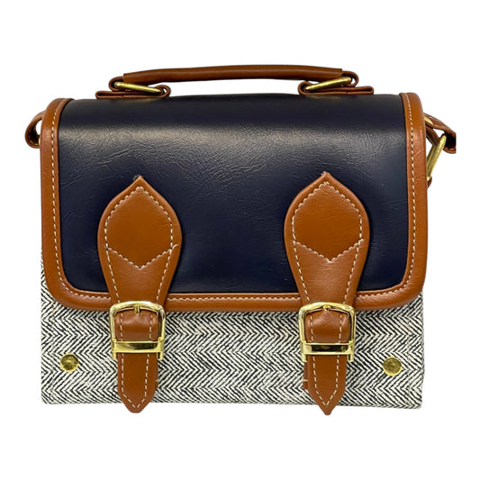Handmade Vegan Leather Satchel – Navy & Tan with Herringbone Fabric | Elegant Crossbody Bag 21x14x9 cm