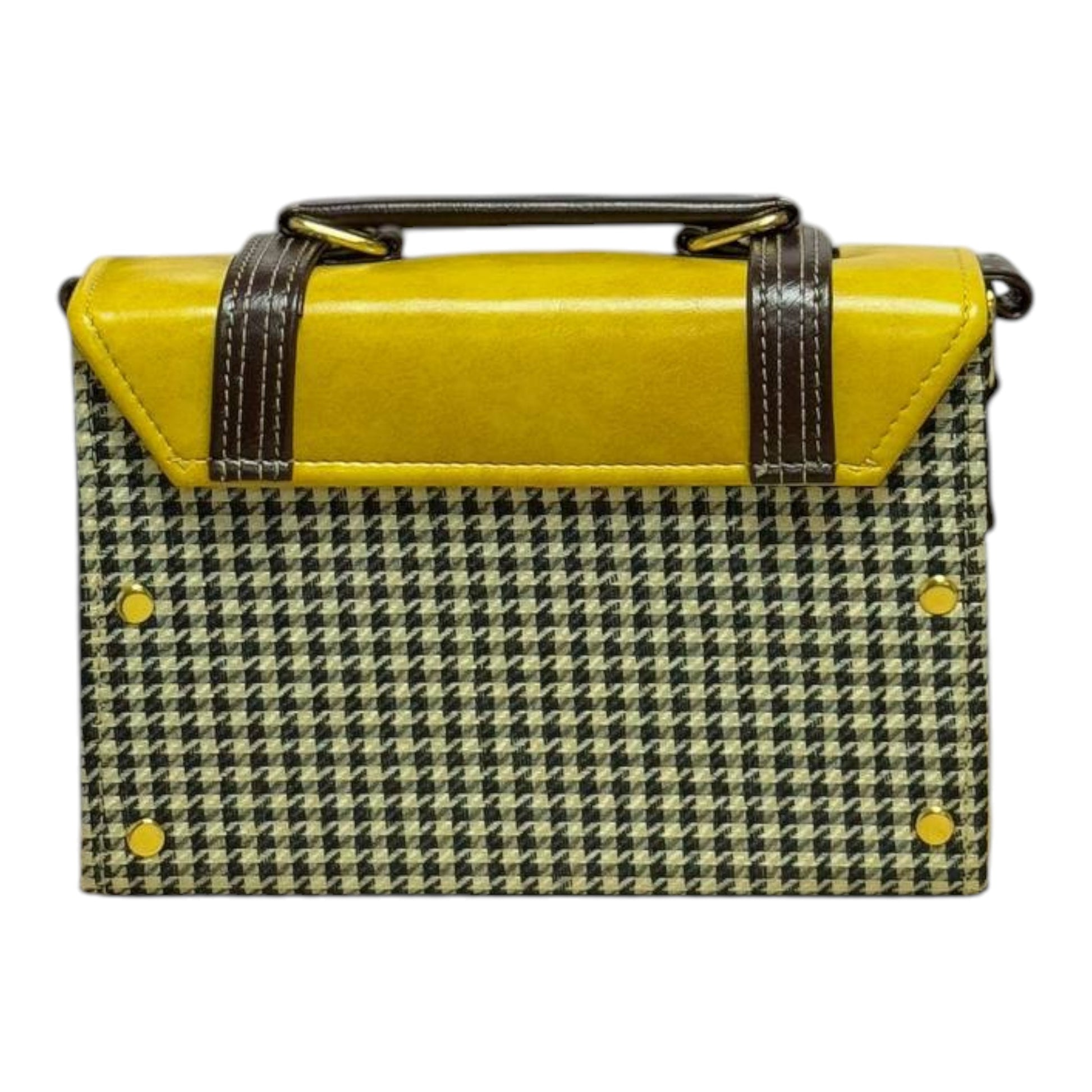 Add a bold yet timeless touch to your style with this handmade vegan leather satchel, featuring a rich mustard yellow top, chocolate brown accents, and a black-and-white houndstooth base. The elegant gold hardware and detailed stitching showcase artisanal craftsmanship, while the structured design offers everyday functionality in a statement-making form.