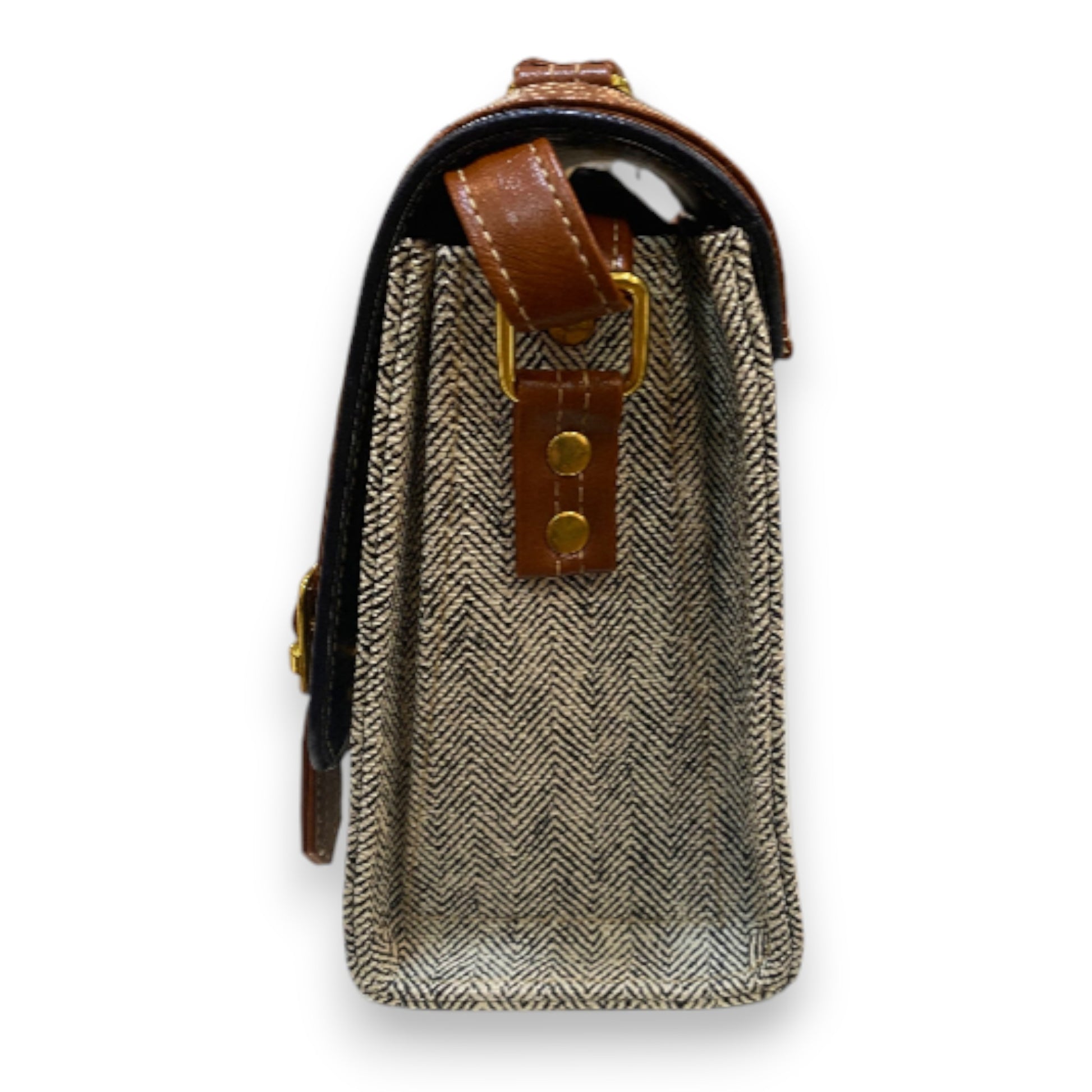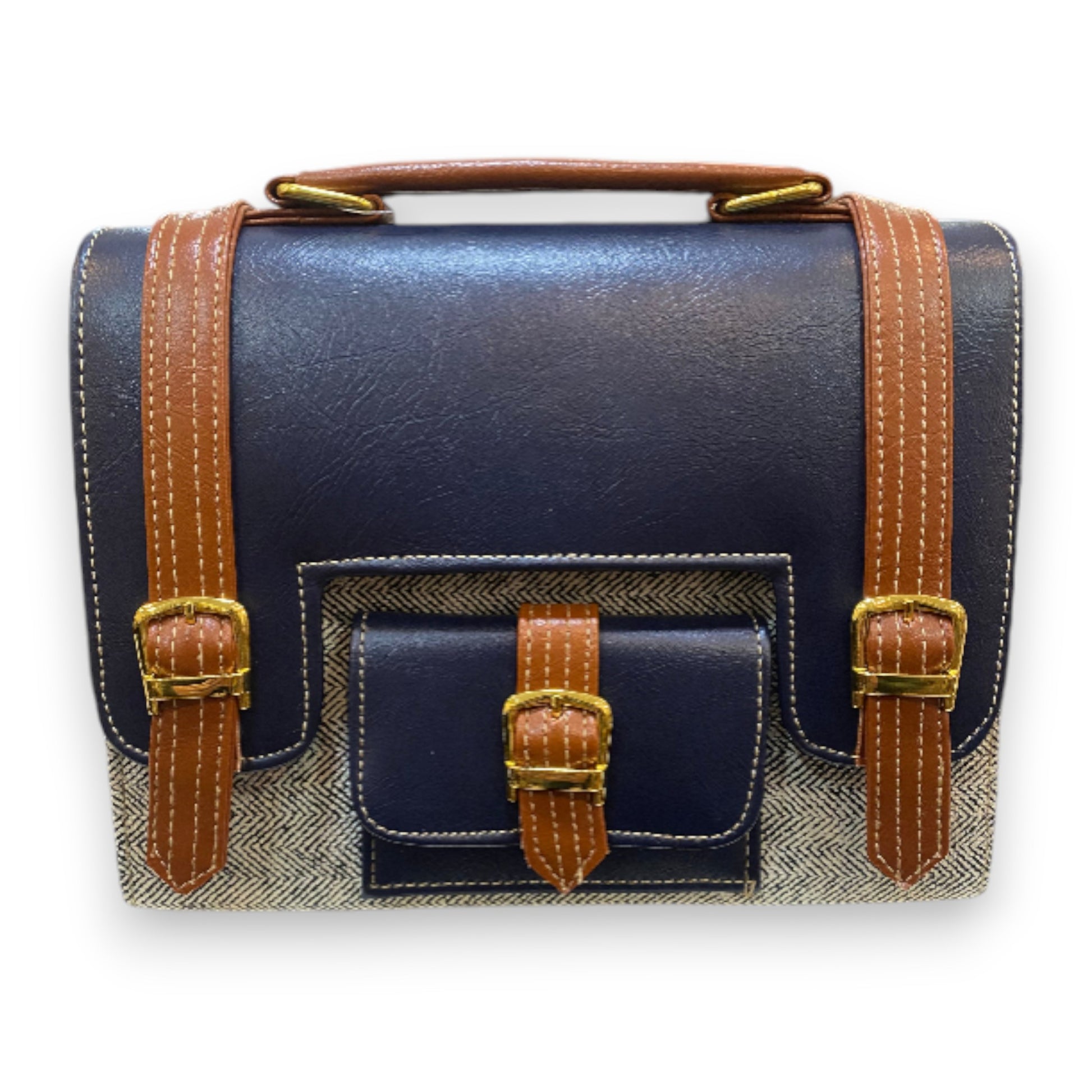 This handcrafted vegan leather satchel combines classic British charm with modern functionality. Featuring a deep navy blue body, contrasting tan straps, and a woven beige herringbone fabric base, this structured bag stands out for its refined elegance and timeless silhouette.