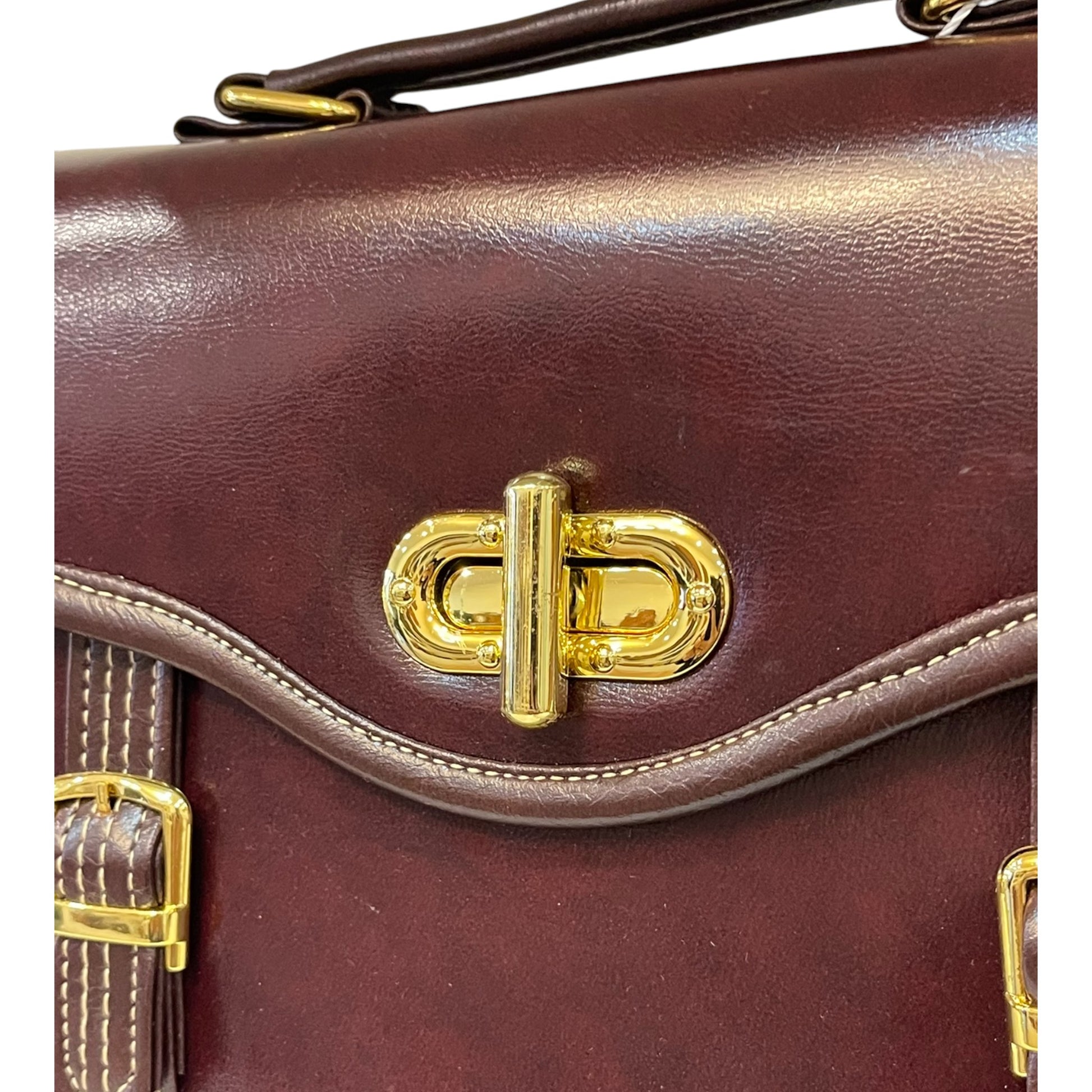 Refined, structured, and timeless — this handmade vegan leather satchel bag combines classic elegance with modern craftsmanship. The rich deep brown tone and gold hardware accents give it a sophisticated edge, while the dual buckle detailing and turn-lock closure add a touch of vintage charm.