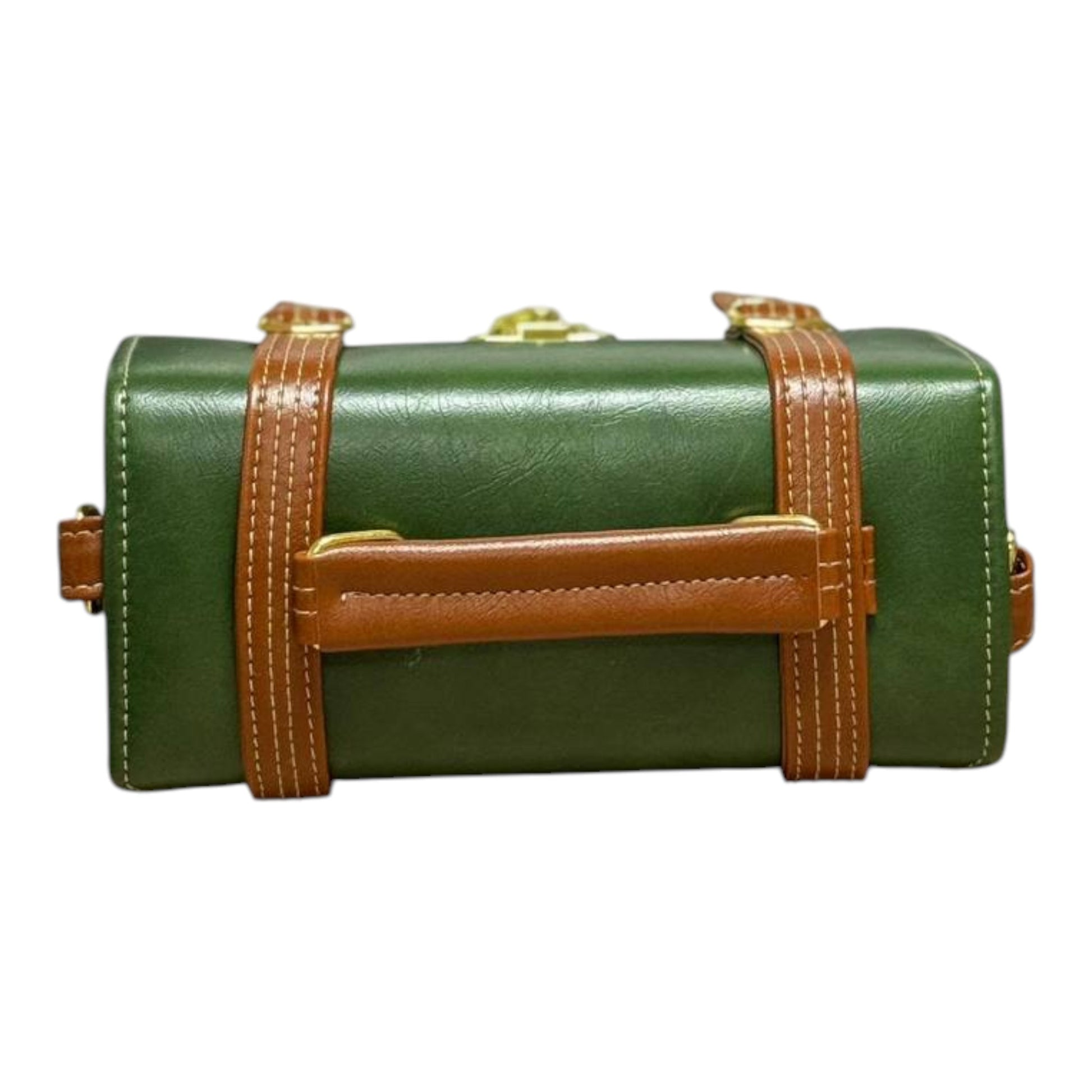 Distinctive, structured, and effortlessly Parisian — this handmade French handbag combines forest green vegan leather with a houndstooth woven base and tan contrast straps.