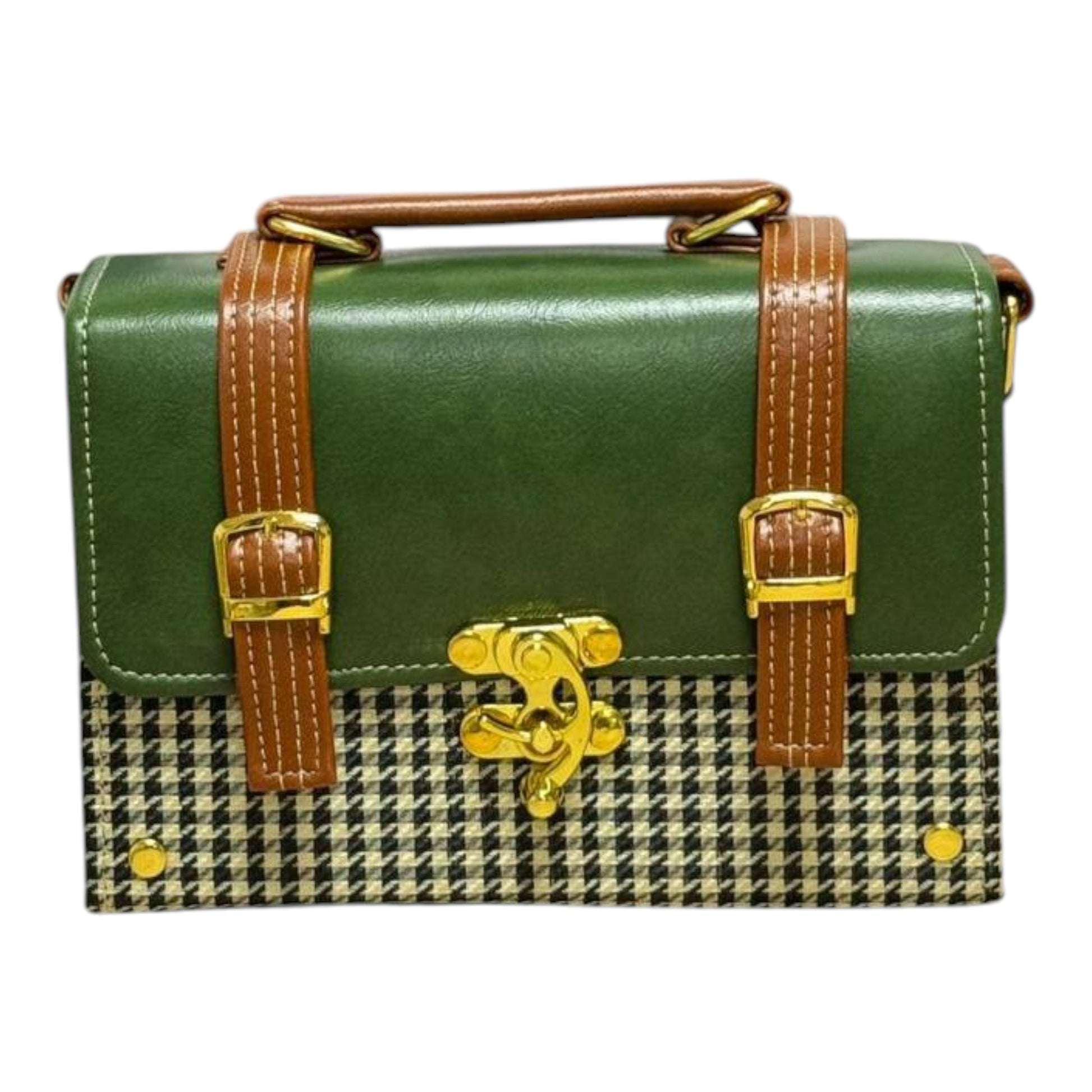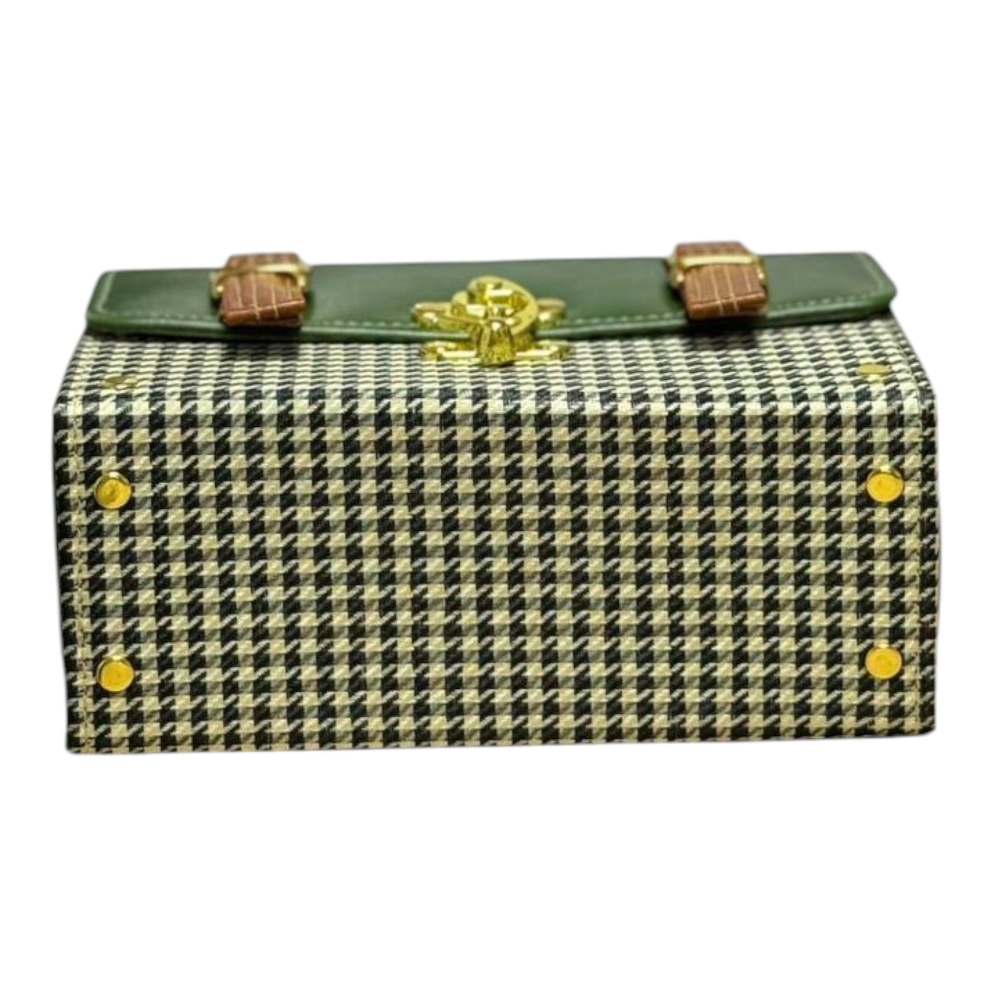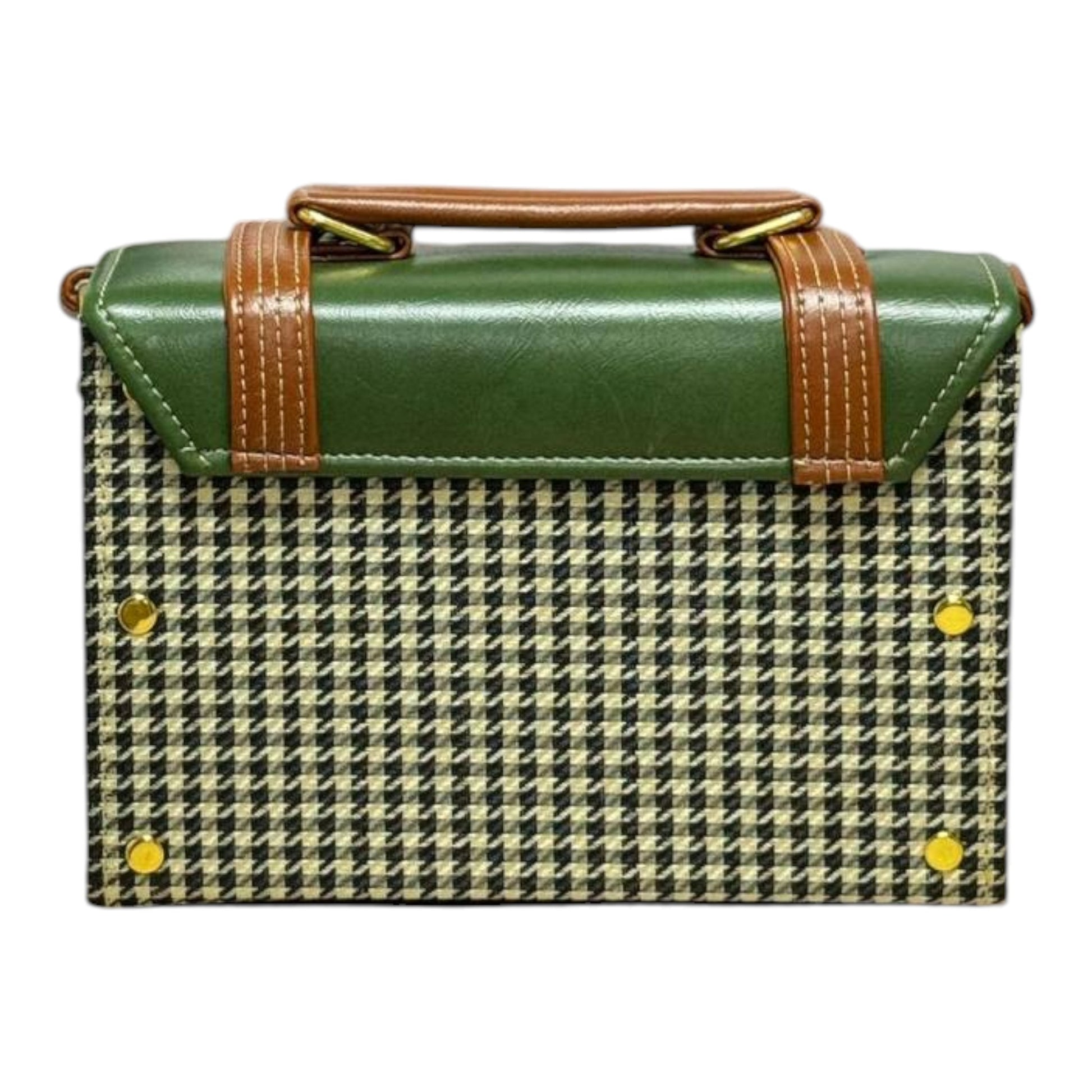 Handmade French Vegan Leather Handbag – Forest Green & Houndstooth with Tan Straps (21×15×9 cm)