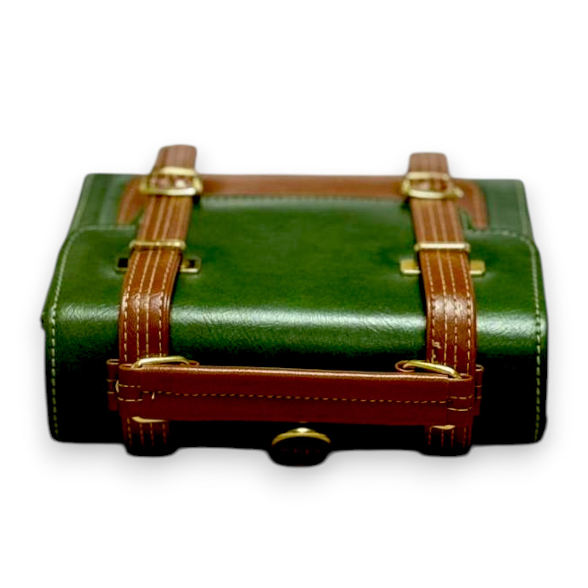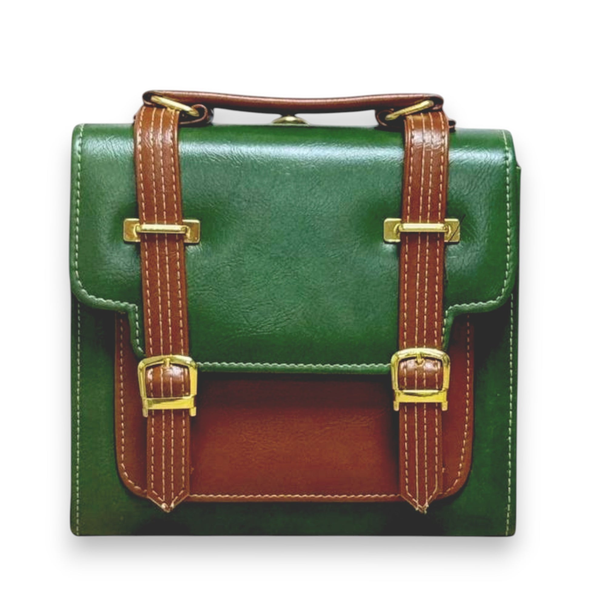 It combines Green vegan leather with Brown straps and gold-tone hardware, giving it a classic look without being outdated.