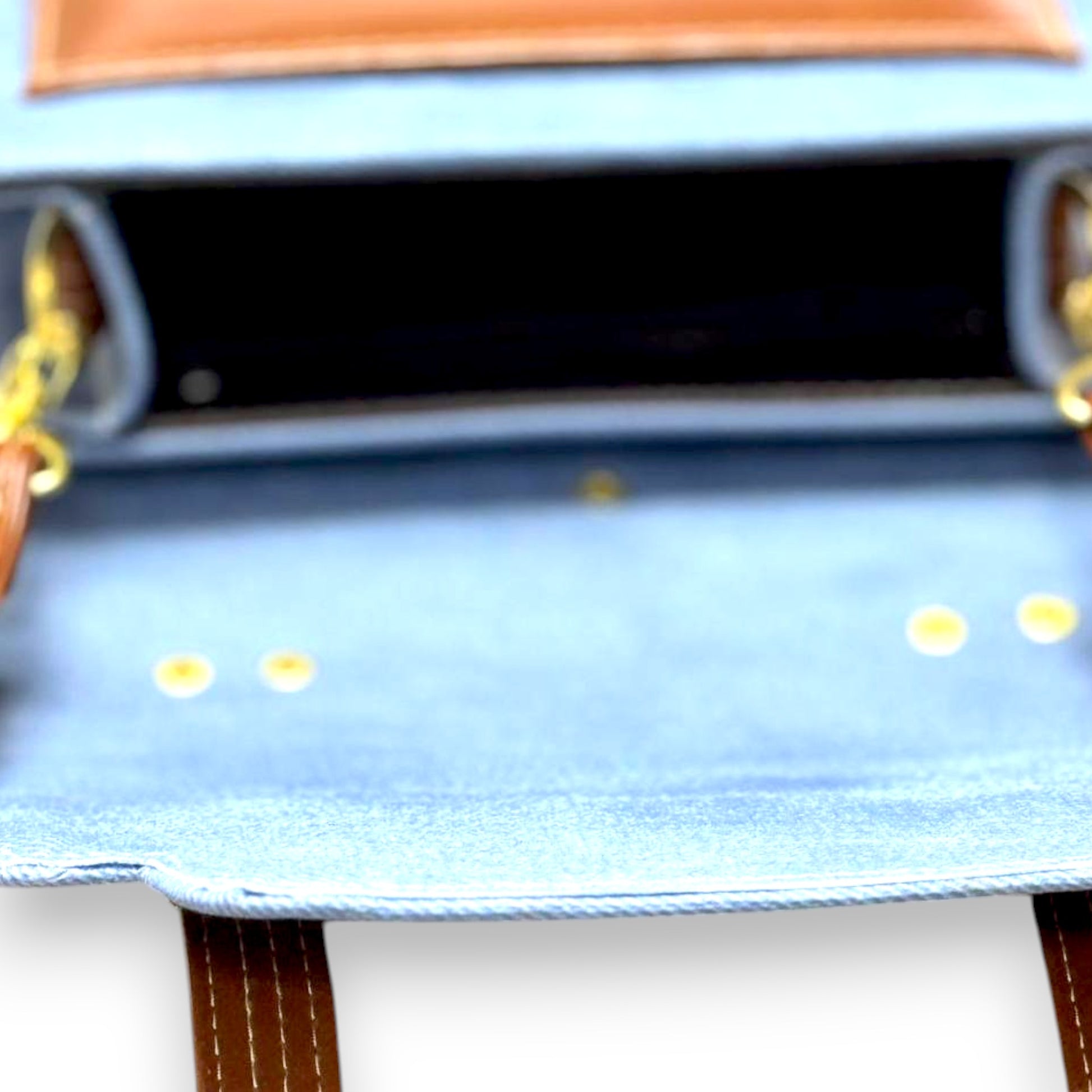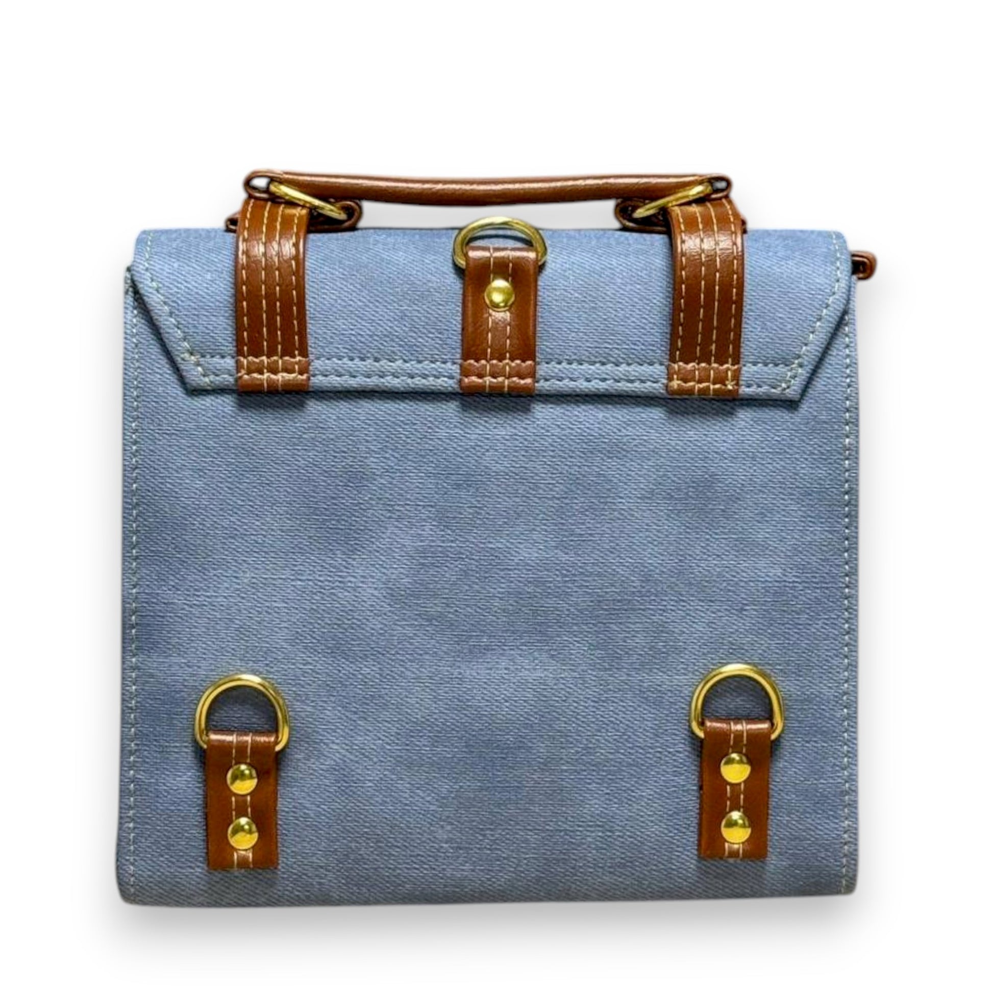 This handmade satchel is crafted from durable blue canvas paired with rich tan vegan leather accents. The structured silhouette, classic buckle straps, and brass-tone hardware give it an elegant yet practical character — perfect for everyday use without looking ordinary.