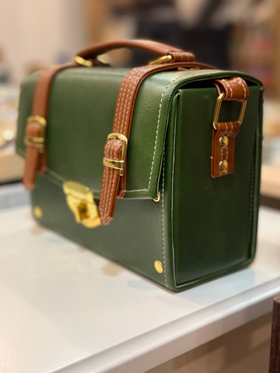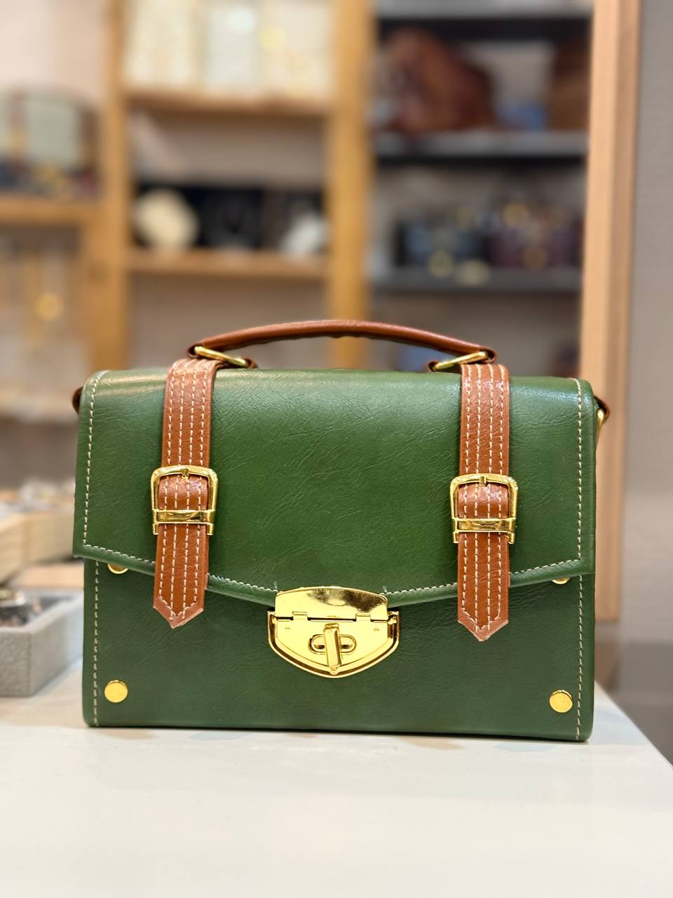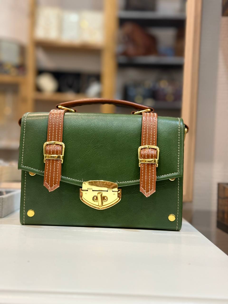 "Elegant and unique, this handmade green leather bag with golden accents is a perfect accessory for any style."