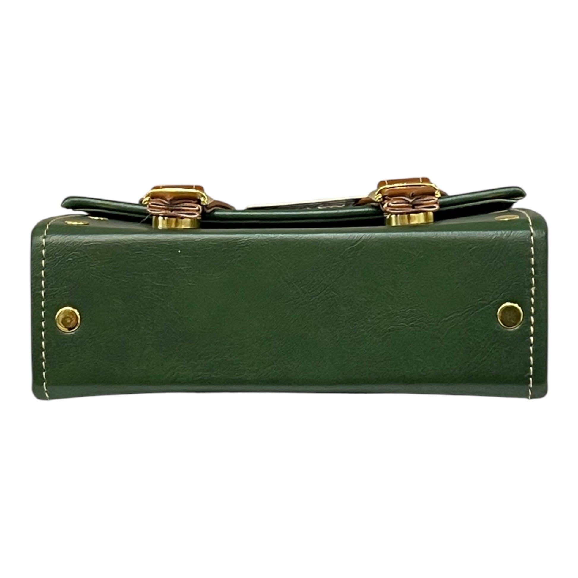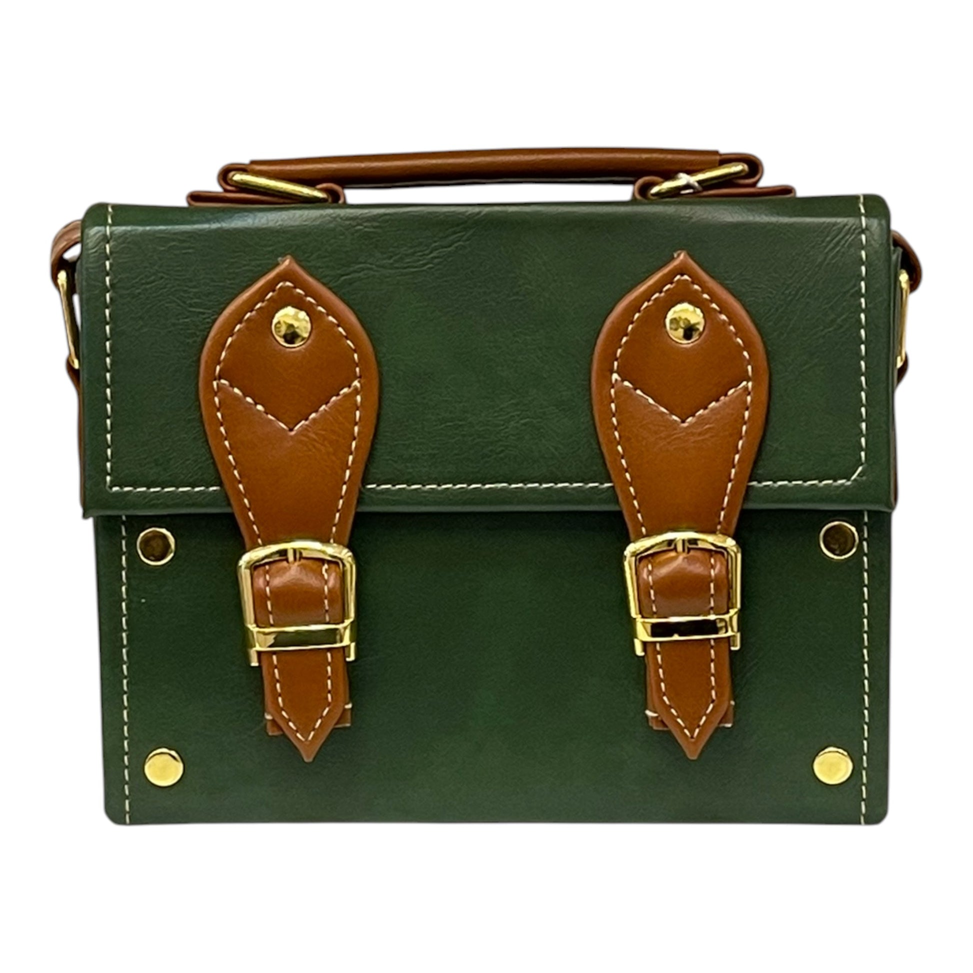 Handmade Green & Brown Vegan Leather Mini Satchel – Retro Crossbody Bag with Gold Buckles | 18x14x6 cm