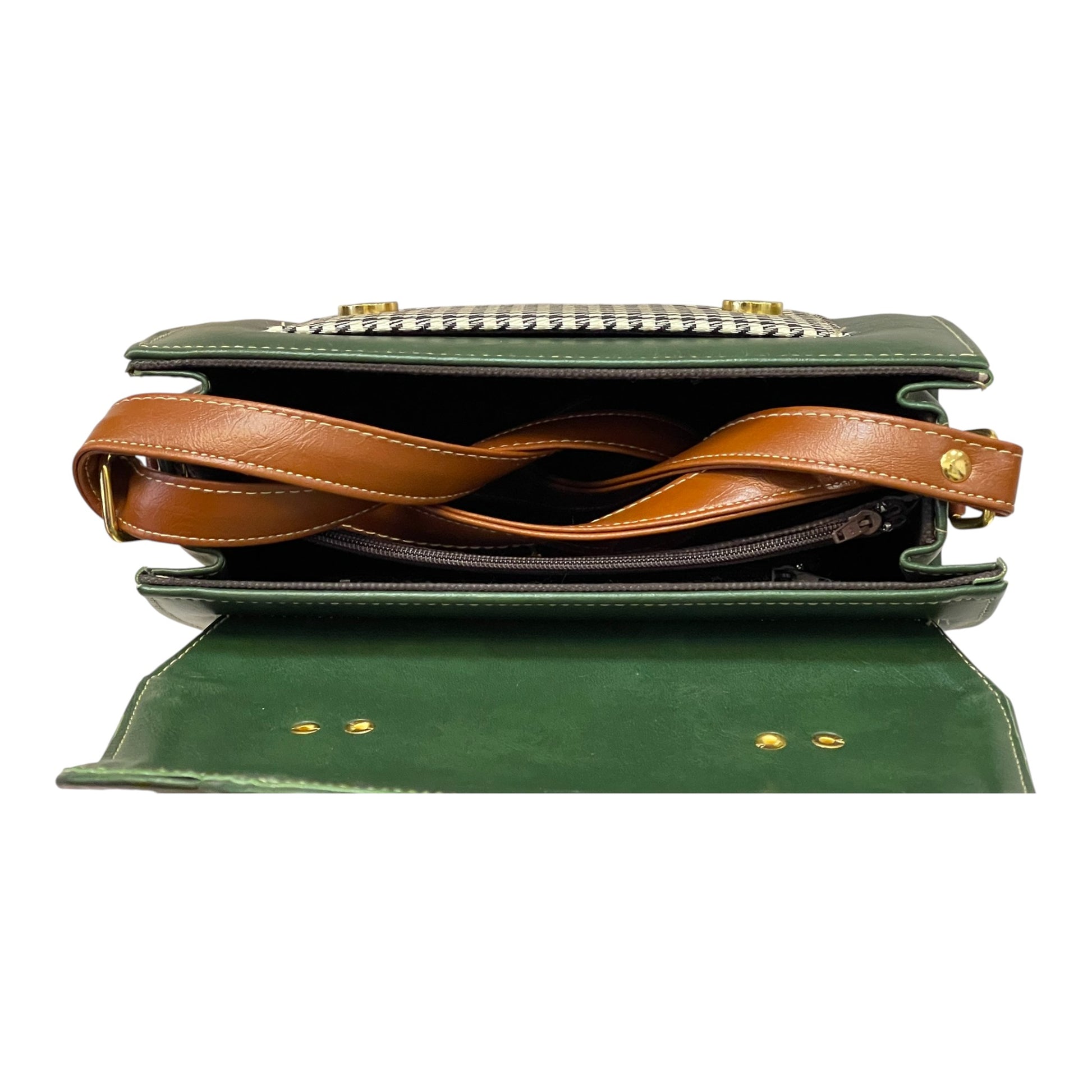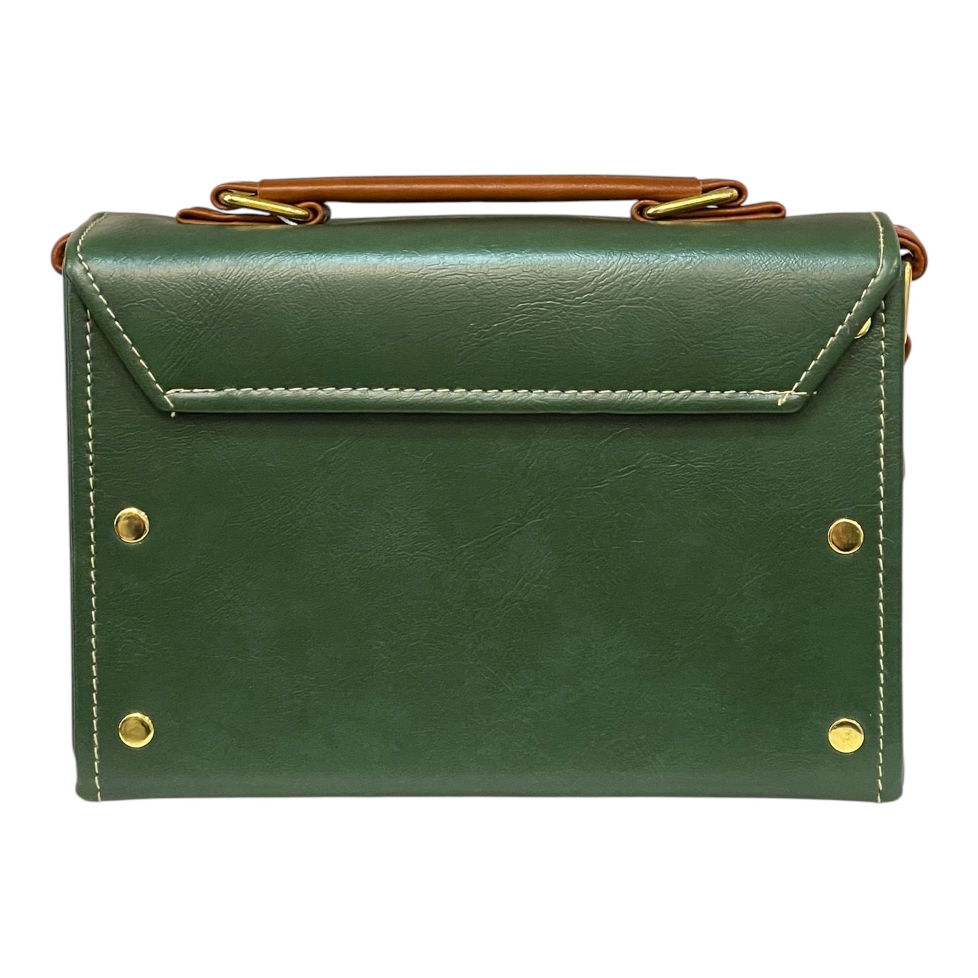 Handmade Green & Brown Vegan Leather Mini Satchel – Retro Crossbody Bag with Gold Buckles | 21x14x9 cm