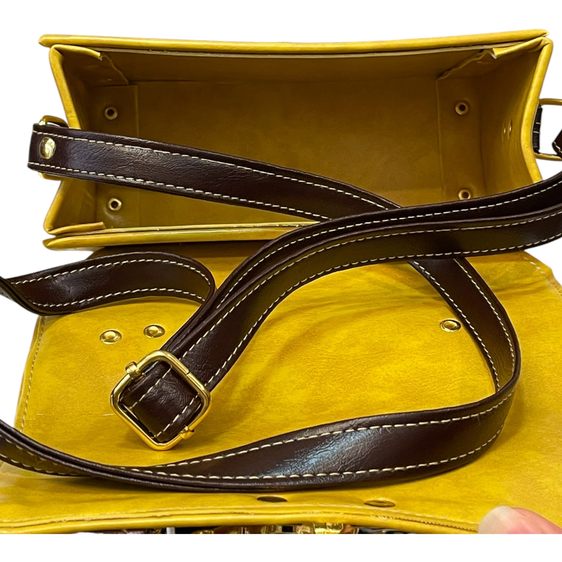 Bright, structured, and beautifully refined — this handmade vegan leather satchel in mustard yellow and dark brown is a statement of elegance with a hint of vintage flair. Its clean lines, contrast stitching, and polished gold twist-lock clasp make it both timeless and versatile.