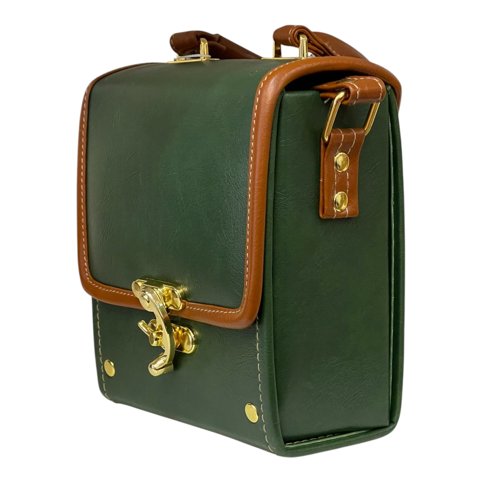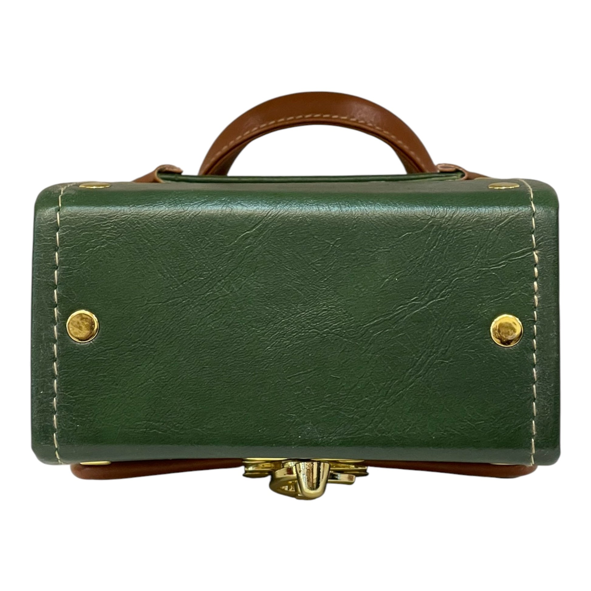 Handmade Vegan Leather Mini Satchel – Forest Green & Tan | Compact Crossbody Bag 16x14x8 cm