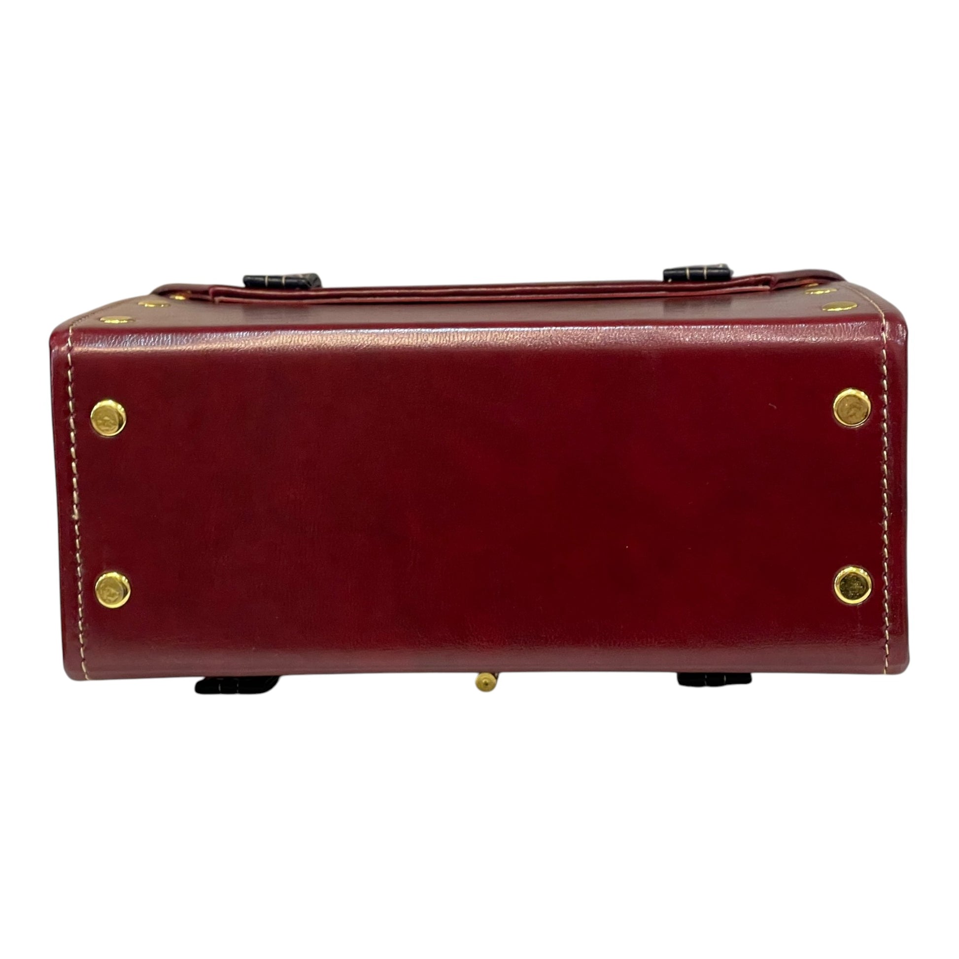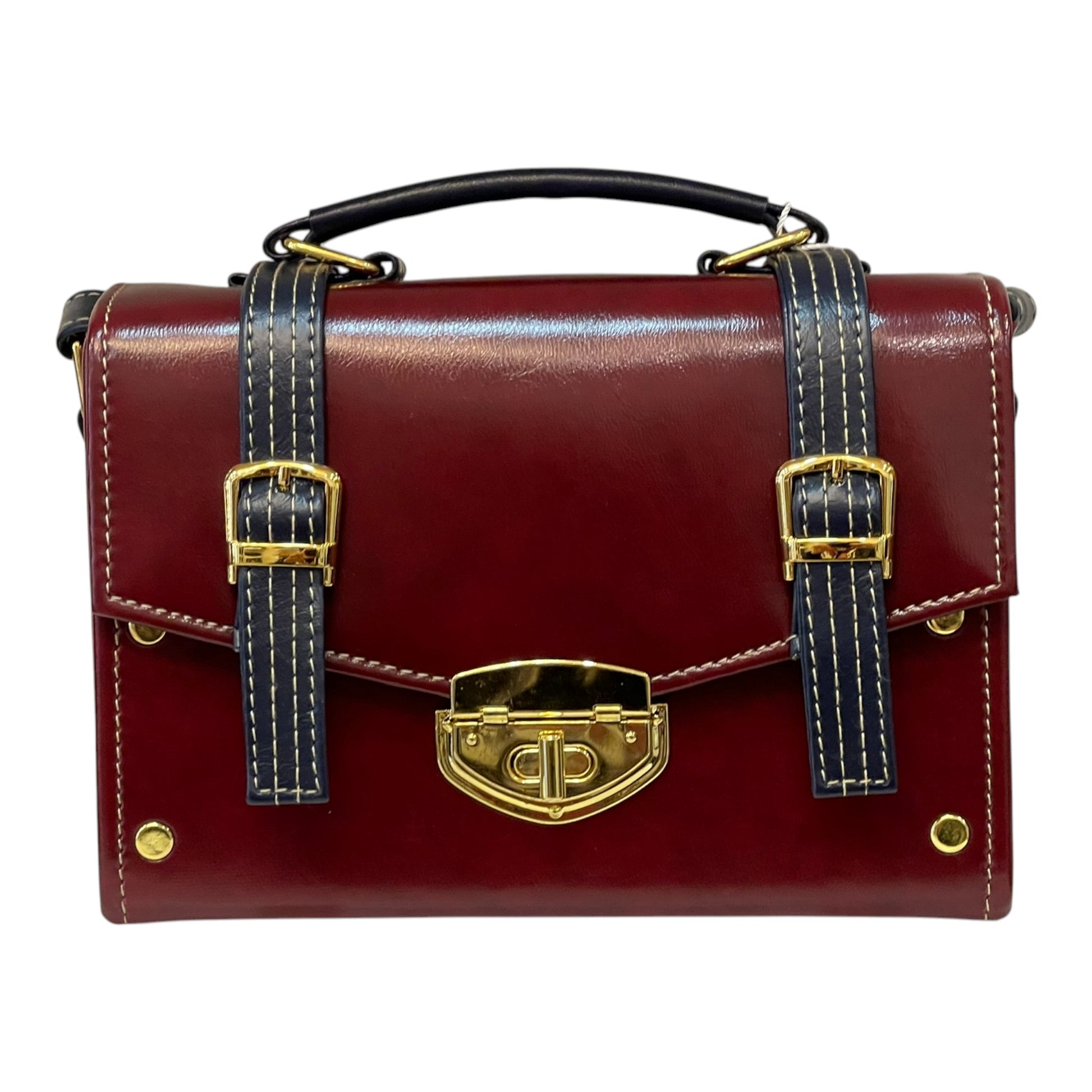 This handcrafted vegan leather satchel bag is where timeless design meets bold sophistication. Made with high-quality, cruelty-free leather in a rich burgundy red tone, it features elegant navy buckle straps and gold hardware that add a touch of vintage charm.