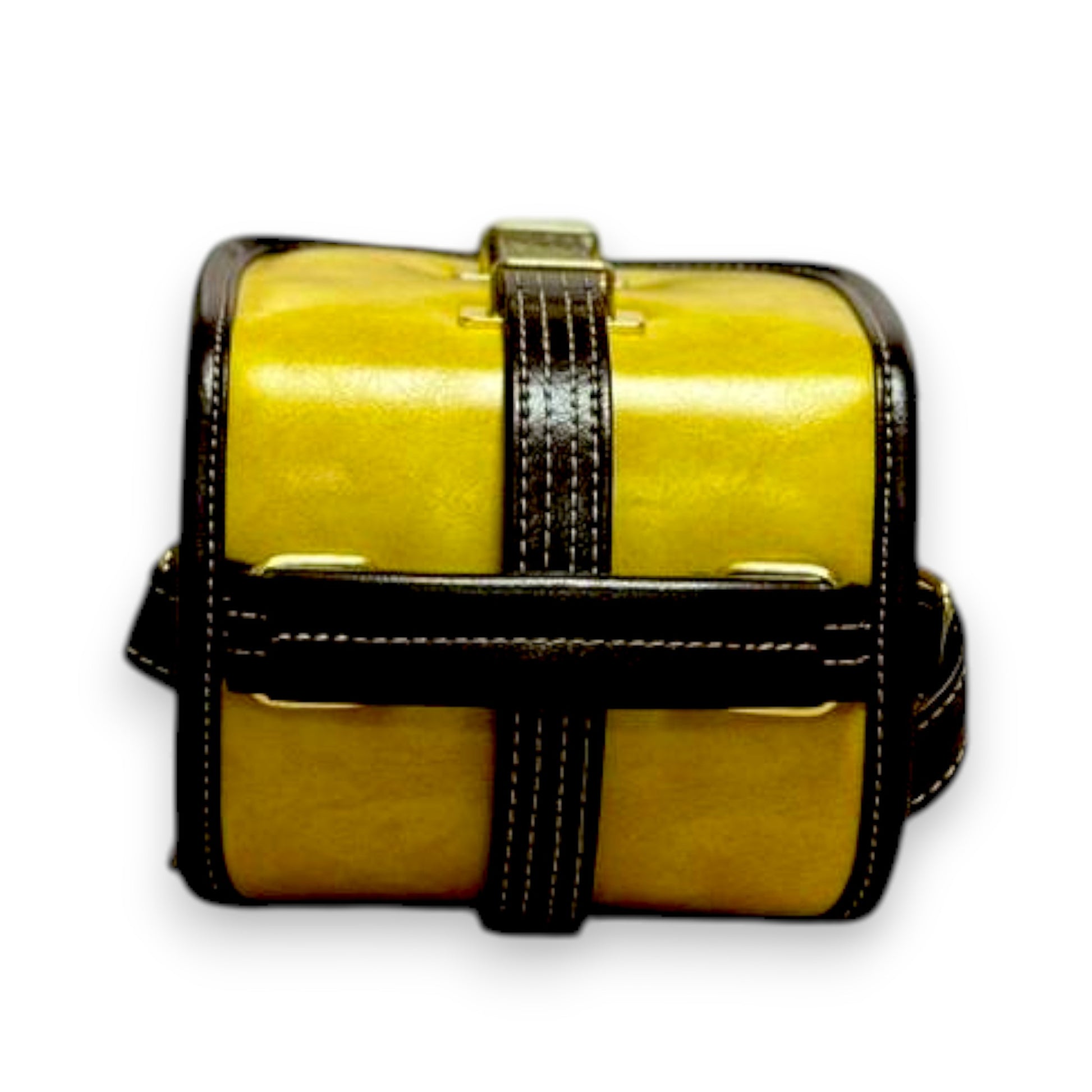 This handmade vegan leather crossbody bag stands out with its rich mustard yellow body, contrasting dark trim, and timeless houndstooth fabric panel. Compact yet structured, it’s designed to carry your essentials without bulk — perfect for daily wear, travel, or statement styling.