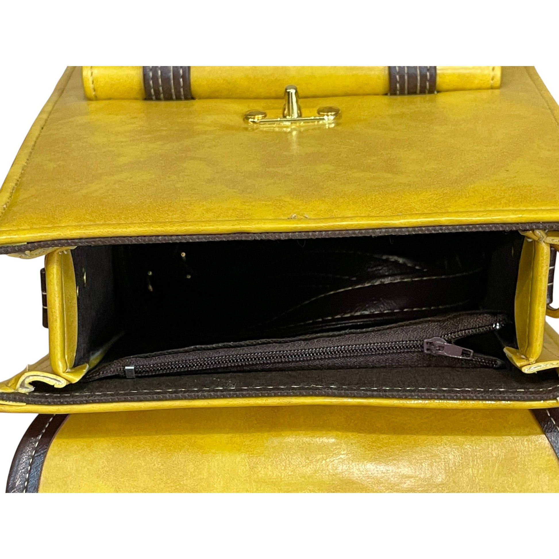 Brighten your day with this handcrafted vegan leather backpack in a rich mustard yellow tone, accented with deep brown trim and gold hardware. Combining playful charm with elegant structure, this bag is perfect for adding personality to your everyday look.
