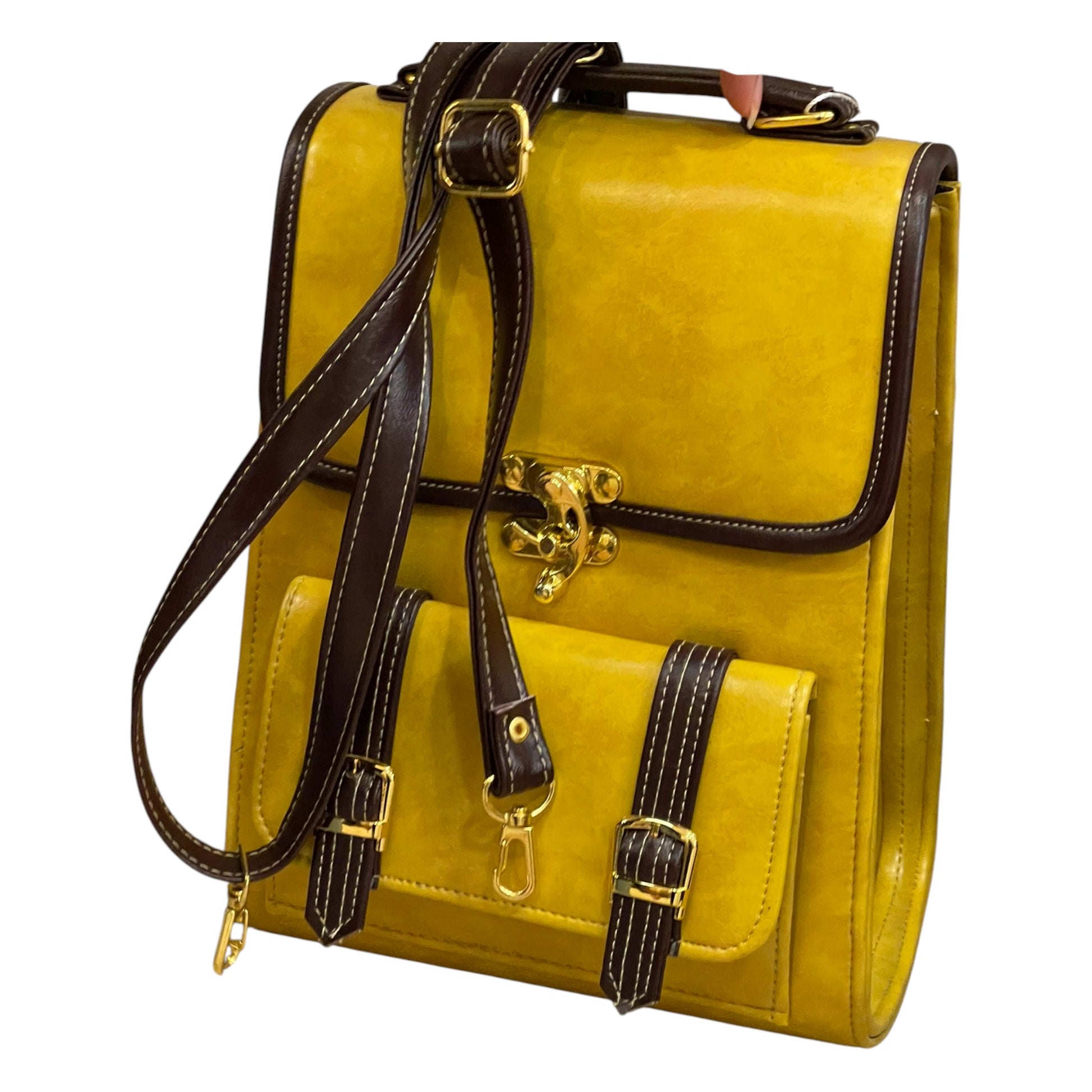 Handmade Vegan Leather Backpack – Mustard Yellow with Brown Trim & Gold Hardware (27x21x13 cm)